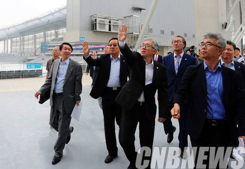 ▲23일 김종덕 문화체육관광부 장관이 9월 중순 인천아시아경기대회가 열리는 주경기장을 찾아 인천아시아경기대회조직위원회 관계자들과 경기장을 둘러보고 있다.(사진=문체부)