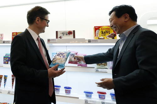 ▲롯데마케팅 포럼에서 번트 슈미트 교수에게 롯데 그룹사들의 신제품을 소개하고 있는 신동빈 회장(오른쪽).(사진제공=롯데그룹)