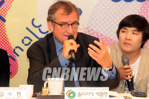 ▲26일 낮 서울 정동 달개비에서 2014부산비엔날레 설명회가 열렸다. 이날 함께한 올리비에 케플렝이 전시 주제에 대해 설명하고 있다.(사진=왕진오 기자)