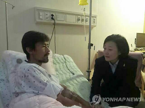 ▲새정치민주연합 박영선 국민공감혁신위원장 겸 원내대표는 26일 서울 동대문구 서울시동부병원에 입원 중인 '유민 아빠' 김영오 씨를 찾아 대화하고 있다. (사진= 새정치민주연합 제공 )