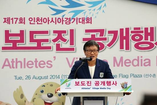 2014인천아시아경기대회 조직위원회(위원장 김영수)는 26일 오전 11시 인천광역시 남동구 구월동 구월아시아드선수촌 국기광장에서 이에리사 선수촌장의 주관으로 국내외 보도진 공개행사를 가졌다.