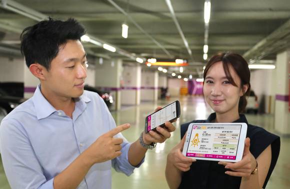 ▲U+Biz EMS 스마트 조명제어 솔루션이 설치된 지하주차장에서 직원들이 LTE 스마트폰을 통해서 조명의 밝기를 제어하고 있다(사진 제공: LG유플러스)