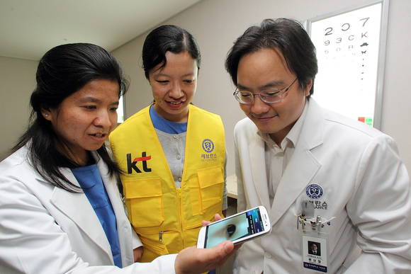 ▲개발도상국의 ‘트라코마’ 환자가 세브란스병원 안과학교실 윤상철 교수와 함께 ‘트라코마’ 앱을 사용하고 있다(사진 제공: KT)