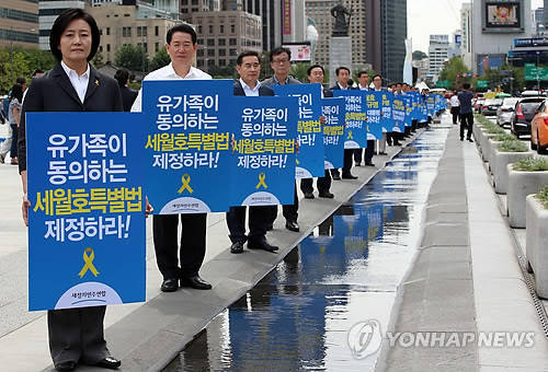 ▲박영선 국민공감혁신위원장 겸 원내대표를 비롯한 새정치민주연합 의원들이 27일 서울 세종대로 광화문 광장에서 여야 유족이 참여하는 3자협의체 수용을 촉구하는 피켓팅을 하고 있다. (사진=연합뉴스)