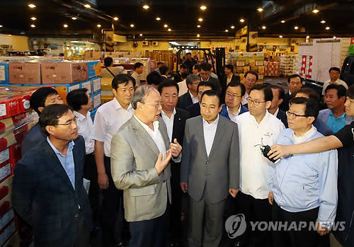 ▲이완구 원내대표와 새누리당 국회 농림해양수산위원회 소속 의원들이 28일 오전 서울 송파구 가락농수산물도매시장에서 추석 물가 점검 민생현장 방문에 나서 청과 경매장을 둘러 보고 있다. (사진=연합뉴스)