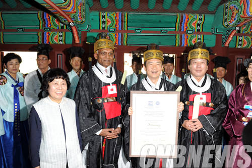 ▲28일 오전 남한산성 숭렬전에서 진행된 '남한산성 세계유산 등재 인증서 전달행사'에서 유네스코 세계유산센터 키쇼 라오 소장(왼쪽 두번째)으로 부터 등재 인증서를 받고 있는 나선화 문화재청장(맨 좌측)과 인증서를 들고 있는 남경필 경기도지사.(사진=문화재청)
