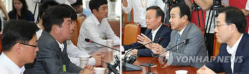 ▲새누리당 이완구 원내대표 등 지도부(오른쪽)와 세월호 일반인 희생자 유가족대책위원회 대표들이 28일 국회 원내대표실에서 간담회를 하고 있다.(사진=연합뉴스)