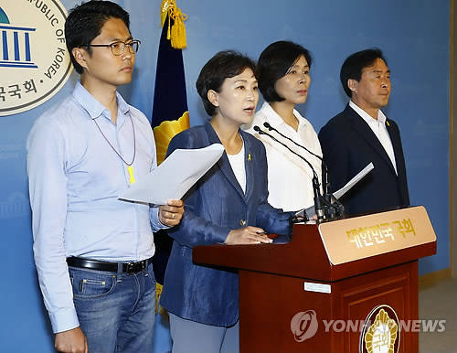 ▲새정치민주연합 세월호 국정조사특별위원회 의원들이 29일 오후 국회 정론관에서 국조특위 청문회 개최를 촉구하는 기자회견을 하고 있다. 왼쪽부터 김광진, 김현미, 최민희, 부좌현 의원.(사진=연합뉴스)
