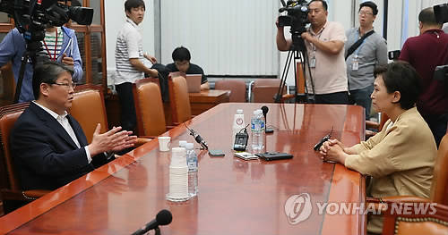 ▲국회 세월호 침몰사고 진상규명을 위한 국정조사특별위원회 새누리당 조원진 간사(왼쪽)와 새정치민주연합 김현미 간사가 10일 국회에서 만나 청문회 증인 등에 대해 논의하고 있다.(자료사진=연합뉴스)