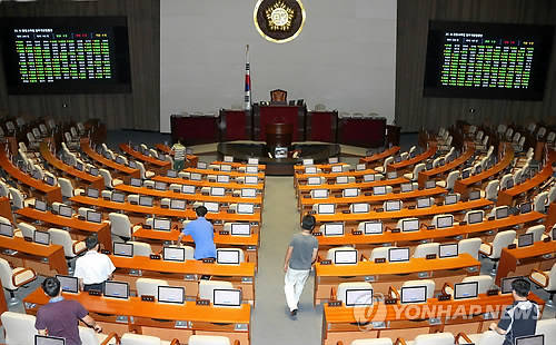 ▲올해 100일간의 정기국회 개회를 하루 앞둔 31일 100일간의 국회 사무처 직원들이 개회식 준비를 위해 본회의장 전산시스템을 점검하고 있다.(사진=연합뉴스)
