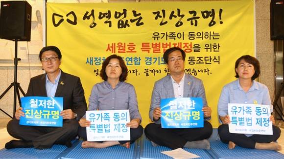 경기도의회 새정치민주연합은 김현삼 대표의원을 비롯하여 김유임 도의회 부의장, 오완석 수석부대표, 원미정 보건복지위원장 등 대표단, 상임위원장단을 중심으로 1일 오후 2시 경기도의회 1층 로비에 천막을 치고 세월호 특별법 제정을 위한 24시간 릴레이 동조 단식에 돌입했다.