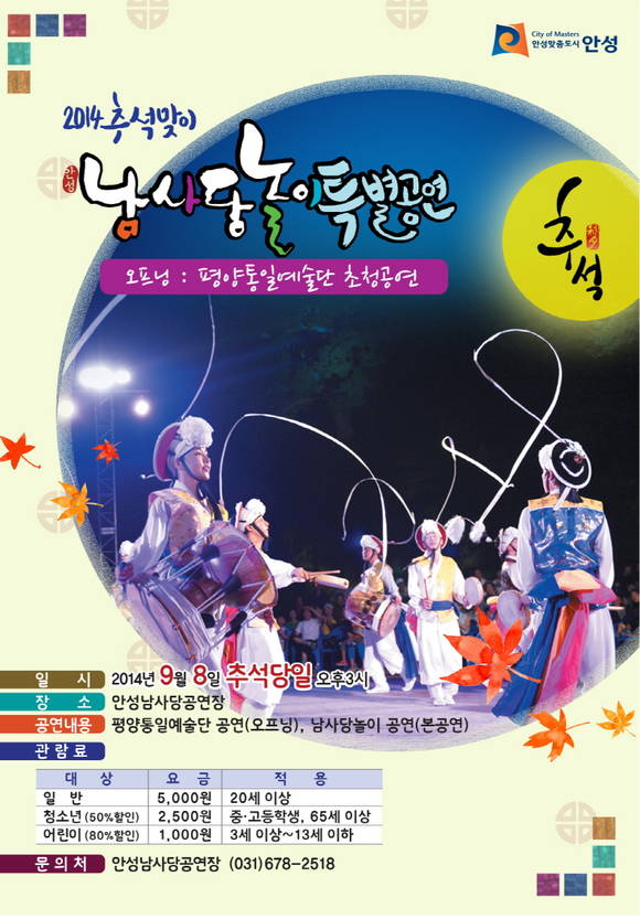 안성시 관계자는 “추석명절 고향을 방문한 가족 친지와 신명나는 공연을 함께 관람하며 즐거운 명절이 되길 바란다”고 말했다.
