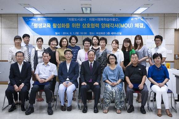 의왕도시공사는 지난 1일, 2014년 의왕시 행복학습마을로 지정된 “부곡동 금천, 오전동 배꽃피는, 청계나눔, 포일숲속 행복학습마을과 평생교육 활성화를 위한 상호협력 MOU(양해각서)를 체결했다.