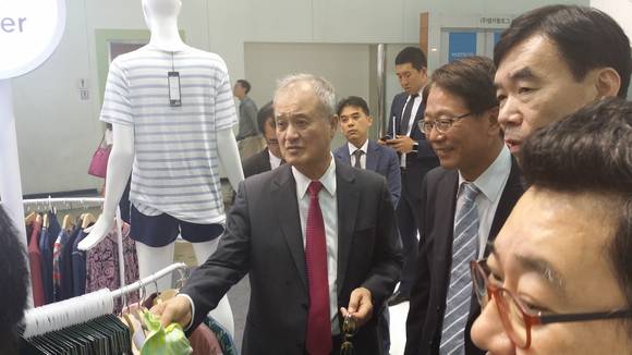 ▲새로 취임한 성기학 섬산련 회장이 프리뷰인서울 전시회를 둘러보고 있다.