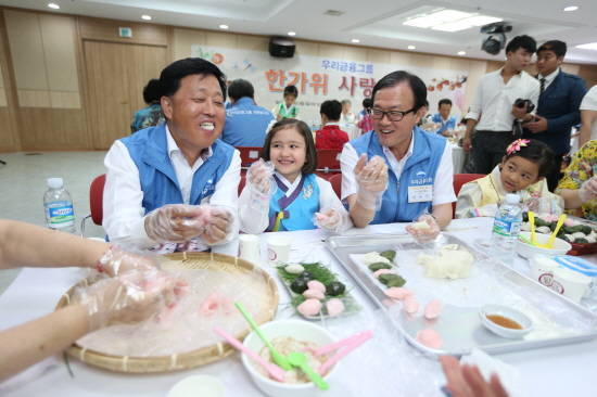 이날 우리금융 이순우 회장을 비롯한 계열사 CEO와 정효성 서울시 행정1부시장, 최창식 중구청장, 공상길 서울시사회복지관협회장 및 중구 지역주민, 다문화가정 부모와 어린이 등 약 100여명이 참여해 서울 중구 신당동에 위치한 유락종합사회복지관에서 송편을 빚었다.