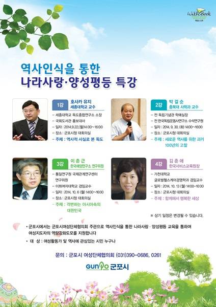 한편 역사특강 3강과 4강은 10월에 진행되며 자세한 정보는 시 홈페이지 새소식란(www.gunpo21.net)을 참조하거나 군포시여성단체협의회(390-0686) 또는 시 여성가족과(390-0261)에 전화로 문의하면 된다.