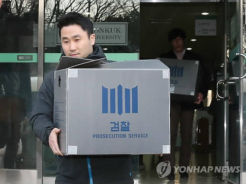 ▲서울동부지검 형사6부(최창호 부장검사) 수사관들이 지난 3월 5일 김경희 이사장의 횡령·배임 혐의 수사와 관련해 건국대 재단 사무실을 압수수색하고 있다. (사진=연합뉴스)