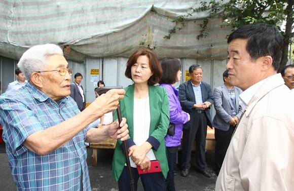 ▲경기도의회 강득구 의장 등 경기도의회 대표단이 한센인 정착촌을 방문해 마을 주민들을 위로하며 의견을 청취 하고 있다.(사진=경기도의회 제공)