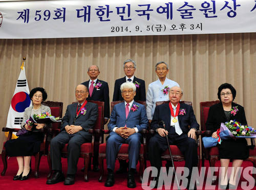 ▲5일 서울 서초구 대한민국예술원에서 ‘제59회 대한민국예술원상’ 시상식이 열렸다. 이날 김종덕 문화체육관광부 장관이 유종호 원장 등 예술상 수상자인 화가 김숙진 씨, 피아니스트 정진우 씨등 주요 내빈들이 기념촬영을 하고 있다.(사진=문화체육관광부)