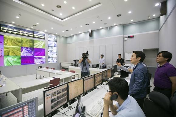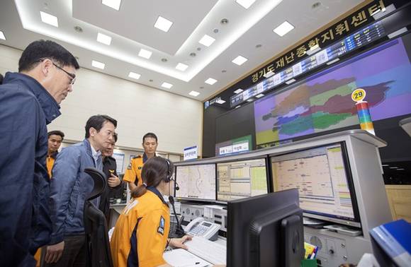 6일 남경필 경기도지사가 경기도재난종합지휘센터를 방문해 추석 명절 연휴 근무자들을 격려 하고 관련 사항을 보고 받고 있다.