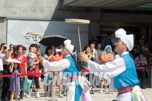 6일 서울 삼청로 국립민속박물관 앞마당에서 추석맞이 한가위 대잔치가 열렸다. 이날 펼쳐진 양주 소놀이굿 공연 중 대원들이 버나돌리기를 하며 공연을 펼치고 있다.