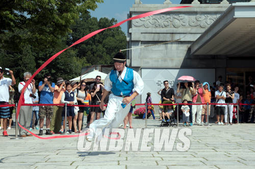 6일 서울 삼청로 국립민속박물관 앞마당에서 추석맞이 한가위 대잔치가 열렸다. 이날 펼쳐진 양주 소놀이굿 공연 중 한 대원이 대형 상모를 돌리고 있다.