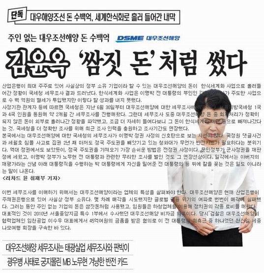 이 언론은 “대우조선에 대한 국세청의 세무조사가 이명박 전 정권 사정의 신호탄으로 보는 시선이 많다”며 의혹을 키웠다.