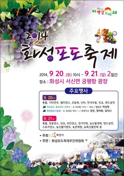 풍성한 가을을 더욱 탐스럽고 달콤하게 하는 ‘2014 화성포도 축제’가 화성시 궁평항(서신면)에서 오는 20일부터 21일까지 열린다.