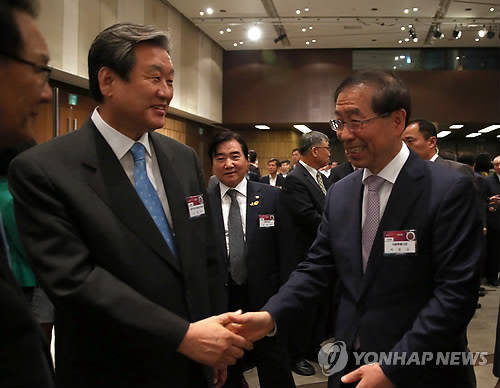 ▲지난 2일 김무성 대표와 박원순 시장이 서울 여의도동 63빌딩 그랜드볼룸에서 열린 제51회 방송의날 기념 축하연에서 악수하고 있다. (자료사진=연합뉴스)