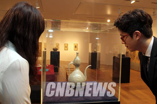이날 공개된 20억 원짜리 보물 1033호 '청자삼감국화문주자·승반'을 관계자가 바라보고 있다.