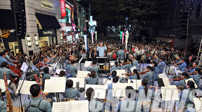 ▲16일 저녁 8시 명동예술극장 앞 특설무대에서 진행된 지휘자 금난새가 이끄는 유라시안 필하모닉 오케스트라의 '명동! 특별한 하루' 공연이 대한민국 쇼핑의 메카 명동에서 3000여명의 관광객 및 시민들이 함께한 가운데 성황리에 막을 내렸다.(사진=충무아트홀)