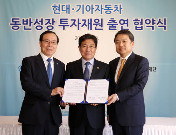 현대·기아차그룹은 18일 서울 중구 소공로 플라자 호텔에서 산업통상자원부 윤상직 장관, 동반성장위원회 안충영 위원장, 현대차그룹 정진행 사장 등 관계자들이 참석한 가운데 동반성장 투자재원 500억원 출연 협약식을 가졌다.
