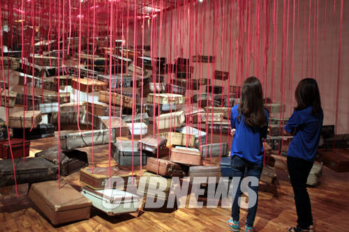 ▲19일 오전 부산시립미술관에서 2014 부산비엔날레 프레스 오픈식이 열렸다. 이날 미술관에 설치된 치하루 사오타의 '축적-목적지를 찾아서' 작품이 공개됐다.(사진=왕진오 기자)