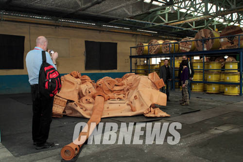 ▲19일 오후 부산 수영구 고려제강 수영공장에서 2014 부산비엔날레 특별전 '아시안 큐레토리얼'전 작품이 공개됐다. 이날 헤사앙규 '탱크 프로젝트' 작품을 취재진들이 감상하고 있다.(사진=왕진오 기자)