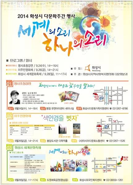다문화주간을 맞아 화성시가 주최하고 화성시지역사회복지협의체 다문화분과가 주관하는 이번 행사의 시작은 24일 오후 2시부터 4시까지 병점 유앤아이센터에서 김규항 작가의 ‘화성인이여~ 다문화 감수성을 펼쳐라’를 주제로 한 강좌로 시작된다.