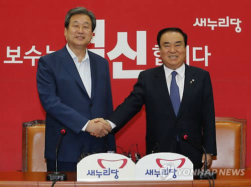 ▲새누리당 김무성 대표(왼쪽)와 새정치민주연합 문희상 비상대책위원장이 22일 오후 4시 국회 새누리당 대표실에서 전격적으로 첫 회동을 가졌다.(사진=연합뉴스)