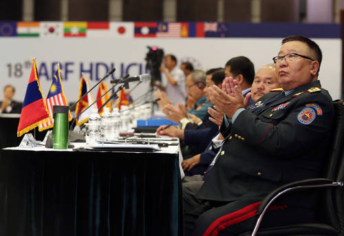 23일 오전 서울 중구 웨스틴조선호텔에서 열린 2014 ARF 국방대 총장회의에 참석한 각국 국방대학교 총장들이 한민구 국방장관의 기조연설을 듣고 있다. (사진 = 연합뉴스)
