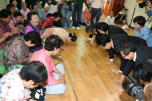 새정치민주연합 박영선 원내대표 등 지도부가 23일 서울시 마포구 성산종합사회복지관 백합경로당을 방문, 어르신들께 큰절하고 있다. (사진 = 연합뉴스)