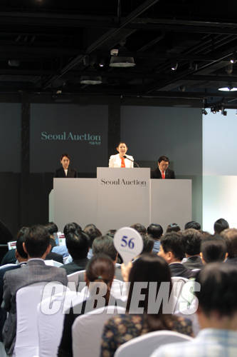 ▲23일 오후 서울 종로구 평창동 서울옥션에서 제133회 메인경매가 시작됐다. 추정가 100억 원대 경매가 시작되자 응찰자가 패드를 들어 응찰을 하고 있다.(사진=왕진오 기자)