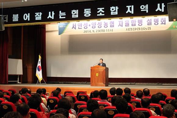 농협중앙회 경기지역본부(본부장 조재록)는 23일 서안성농협(조합장 이호웅)과 양성농협(조합장 오상환)의 자율합병 설명회가 농협 안성교육원에서 열렸다.