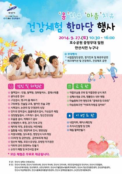 안산시(시장 제종길)는 오는 9월 27일 호수공원에서 세월호침몰사고로 상처받은 지역주민들에게 치유와 회복의 기회를 제공하기 위하여 건강체험 한마당 행사를 개최한다고 24일 밝혔다.
