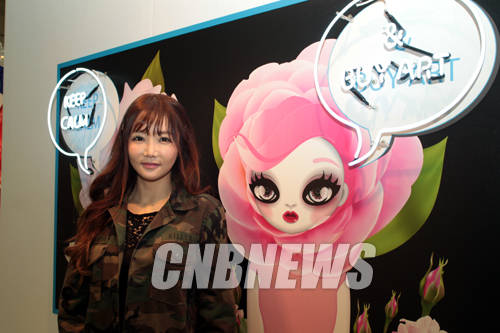 ▲24일 오후 서울 삼성동 코엑스에서 진행된 2014 한국국제아트페어(KIAF14) VIP 오픈식에 참석한 팝 아티스트 마리킴이 가나아트 갤러리 부스에 전시된 자신의 작품과 함께 하고 있다.(사진=왕진오 기자)