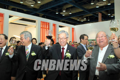 ▲24일 오후 서울 삼성동 코엑스에서 2014 한국국제아트페어 VIP 오프닝 행사가 열렸다. 이날 자리를 함께한 김종덕 문화체육관광부 장관이 행사 성공을 위한 건배 제의에 화답하고 있다.(사진=왕진오 기자)