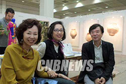 ▲24일 오후 서울 삼성동 코엑스에서 2014 한국국제아트페어 VIP 오프닝 행사가 열렸다. 이날 가나아트갤러리 부스에 함께한 이옥경 서울옥션 부회장과 김홍희 서울시립미술관장 그리고 이호재 서울옥션 회장이 한 자리에서 담소를 나누고 있다.(사진=왕진오 기자)