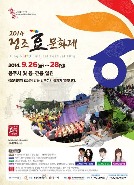 화성시 ‘2014 정조 효 문화제’가 9월 26일부터 28일까지 3일간 효 문화유산이자 정조의 효심이 깊게 서려 있는 사도세자 융릉과 정조와 효의왕후 무덤인 건릉, 그리고 용주사 일원에서 개최된다.