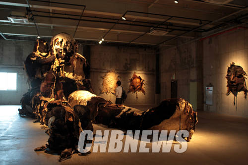 이날 공개된 중국 작가 장환의 '영웅 No. 2'가 전시장을 가득 메우고 있다. 이 작품은 압도적으로 거대한 인체 형상의 작품으로 주재료인 소가죽은 마치 소들의 삶과 기운이 여전히 배어있는 듯한 느낌을 준다.