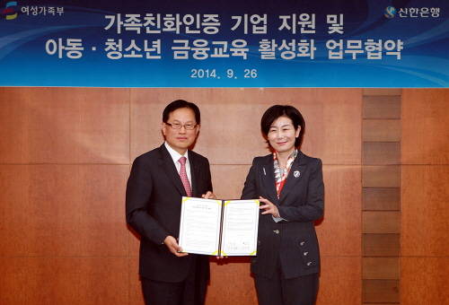 ▲서진원 신한은행장(왼쪽)과 김희정 여성가족부 장관(오른쪽)이 26일 서울 중구 태평로 소재 신한은행 본점에서 진행된 ‘가족친화인증기업 지원 및 아동-청소년 금융교육 활성화 업무협약’ 체결 후 기념촬영하고 있는 모습.(사진제공=신한은행)