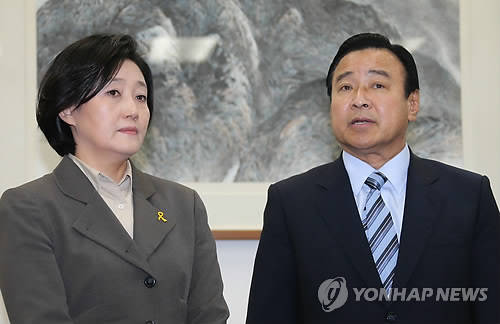 ▲새누리당 이완구(오른쪽) 원내대표와 새정치민주연합 박영선 원내대표가 29일 국회 운영위원장실에서 여야원내대표회담을 마치고 나서 "오후 3시 여야와 유가족이 함께 만나는 3자회담을 개최한다"고 발표하고 있다.(사진=연합뉴스)