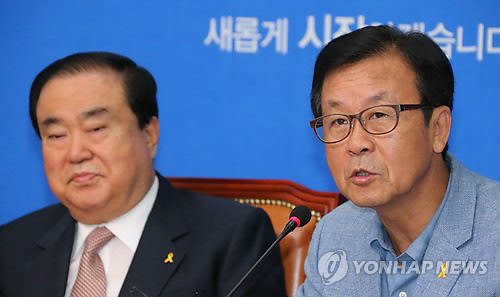 ▲새정치민주연합 원혜영 정치혁신실천위원장(오른쪽)이 30일 국회에서 정치혁신실천위원회의 1차회의에서 혁신실천을 강조하고 있다. 왼쪽은 문희상 비상대책위원장.(사진=연합뉴스)