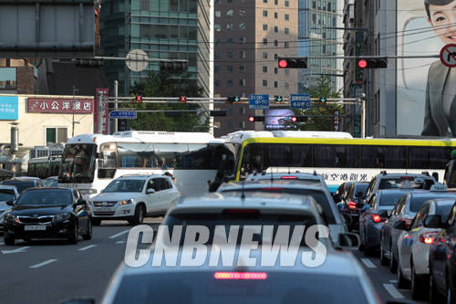 ▲30일 오후 4시 30분경 조선호텔앞 남대문로 7길에서 관광버스 두 대가 충돌하는 사고가 발생했다. 이 사고로 인해 남산 3호터널 강남 방향으로 가는길이 완전이 막혀있다.(사진=왕진오 기자)